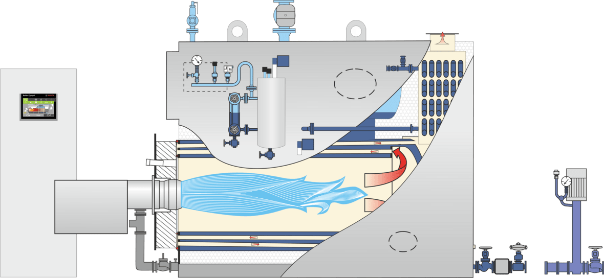 - Der integrierte Economiser hat direkten Einfluss auf die Energieeffizienz. In den Abgasen enthaltene Wärme wird zur Vorwärmung des Kesselspeisewassers verwendet und dadurch zum Großteil zurückgewonnen, Brennstoffverbrauch und Emissionen werden reduziert.