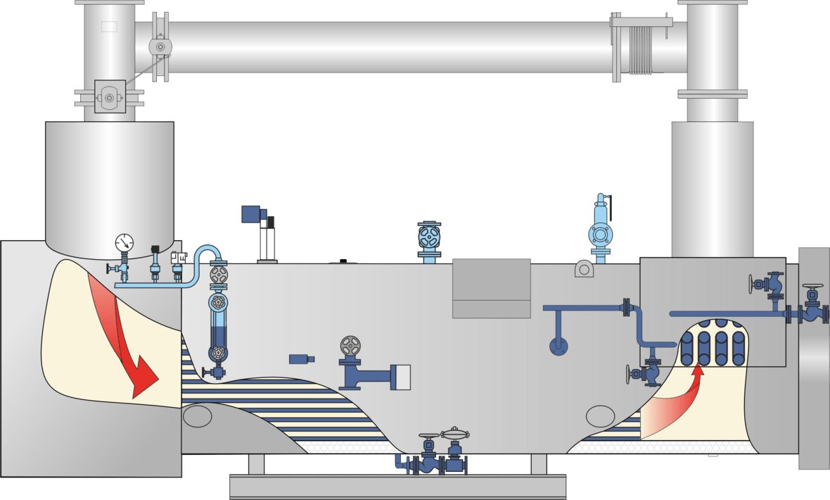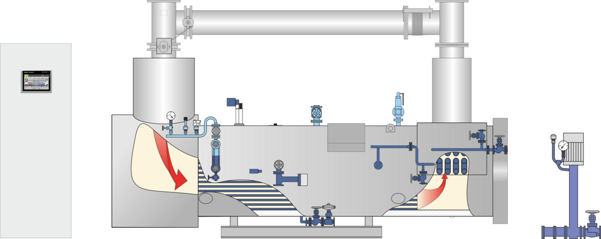 A caldeira de vapor de recuperação de calor está isolada e equipada com modernos dispositivos de segurança. Por razões de transporte, o bypass para os gases de escape é fornecido avulso, a sua montagem e isolamento são efetuados no local pelo proprietário. O controlo da caldeira BCO, com base no PLC e apto para uso através de ecrã tátil, encontra-se integrado num quadro de distribuição separado que pode ser mural ou de chão.